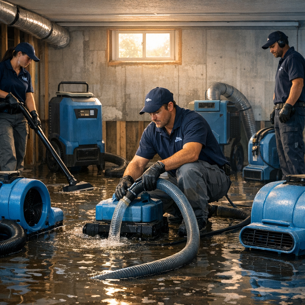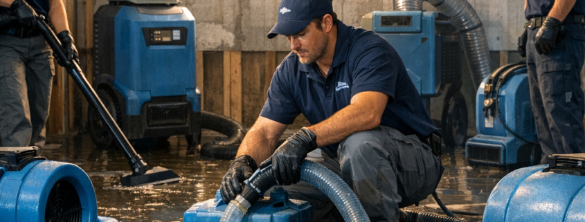 Technicians start with high-power pumps and truck-mounted extractors for large volumes, then move to portable extractors. Moisture meters and thermal imaging map trapped moisture inside walls and floors so drying targets the real problem areas.